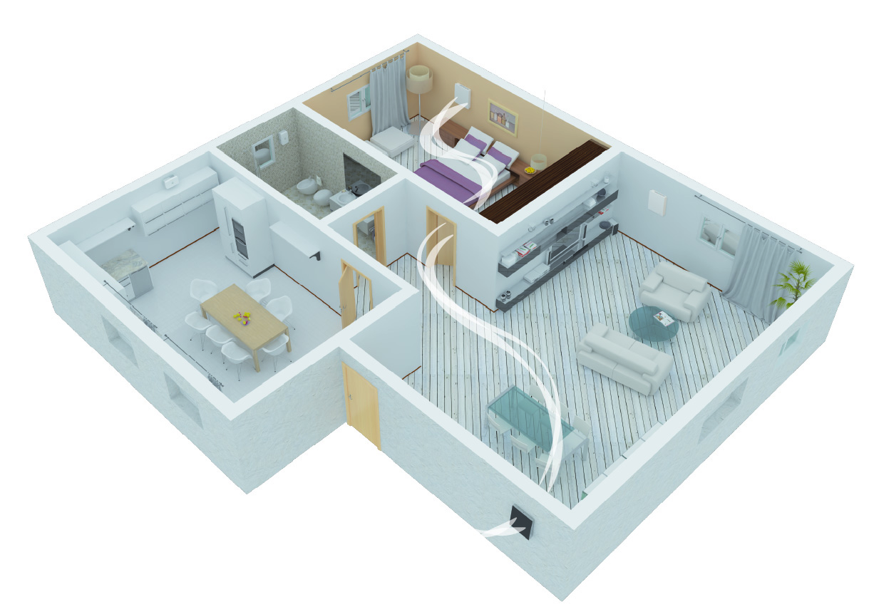 Unidad compacta de inyección y extracción de aire con 90% de eficiencia térmica, ideal para habitaciones, cocinas y baños.